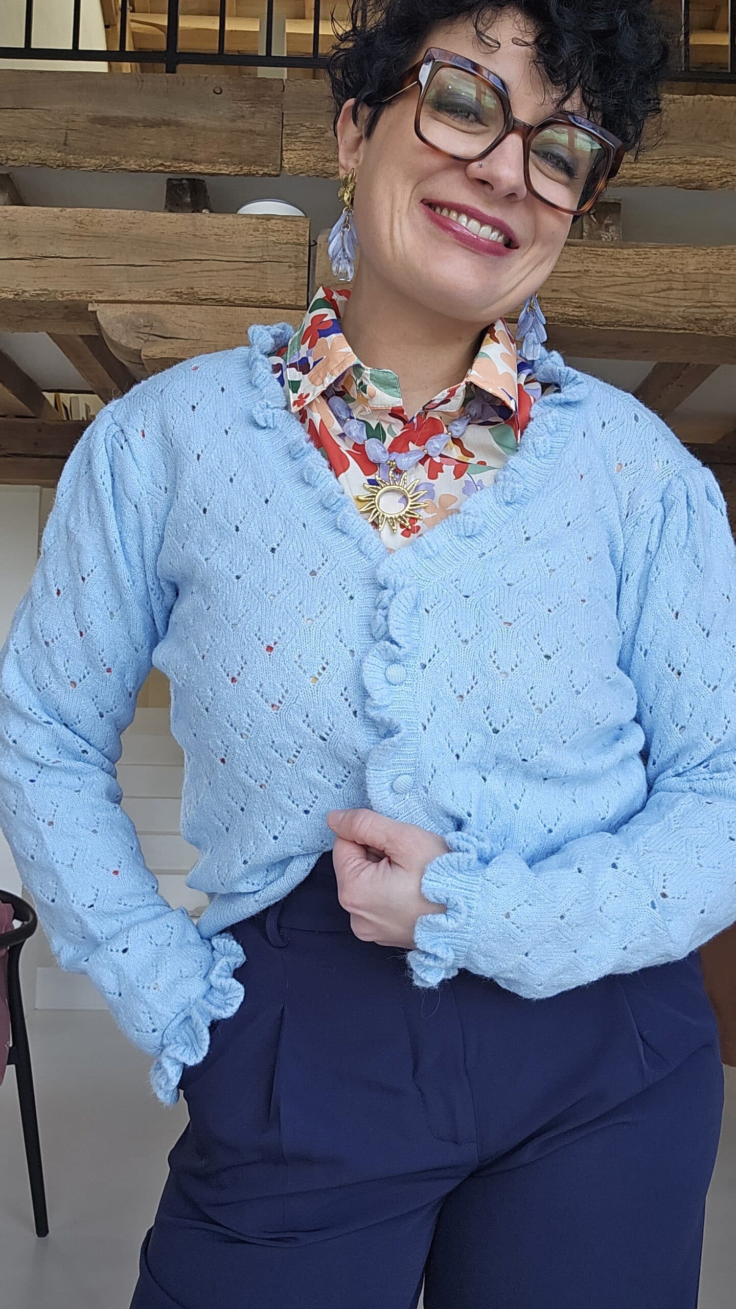Vous pouvez le twister avec le gilet Carrie bleu ciel.