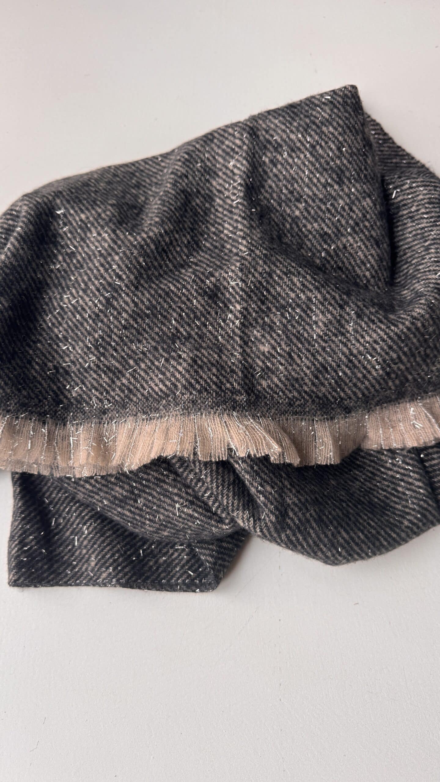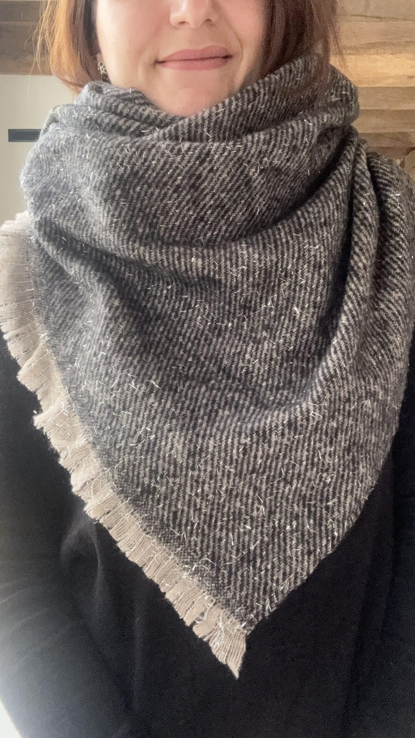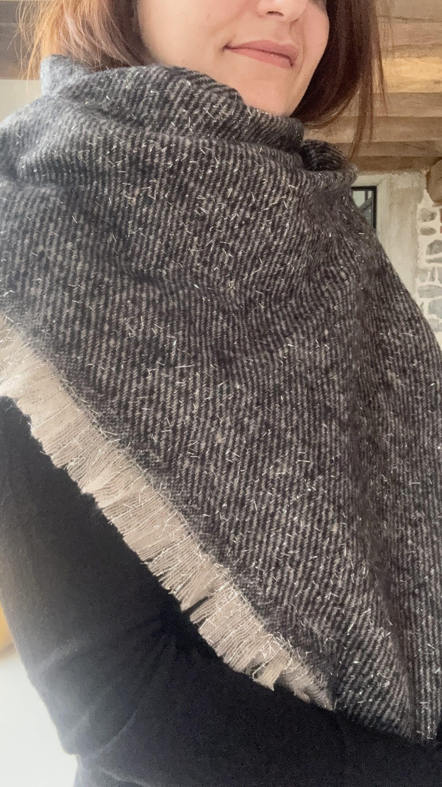 Grande echarpe grise, beige et fils paillettes argentés