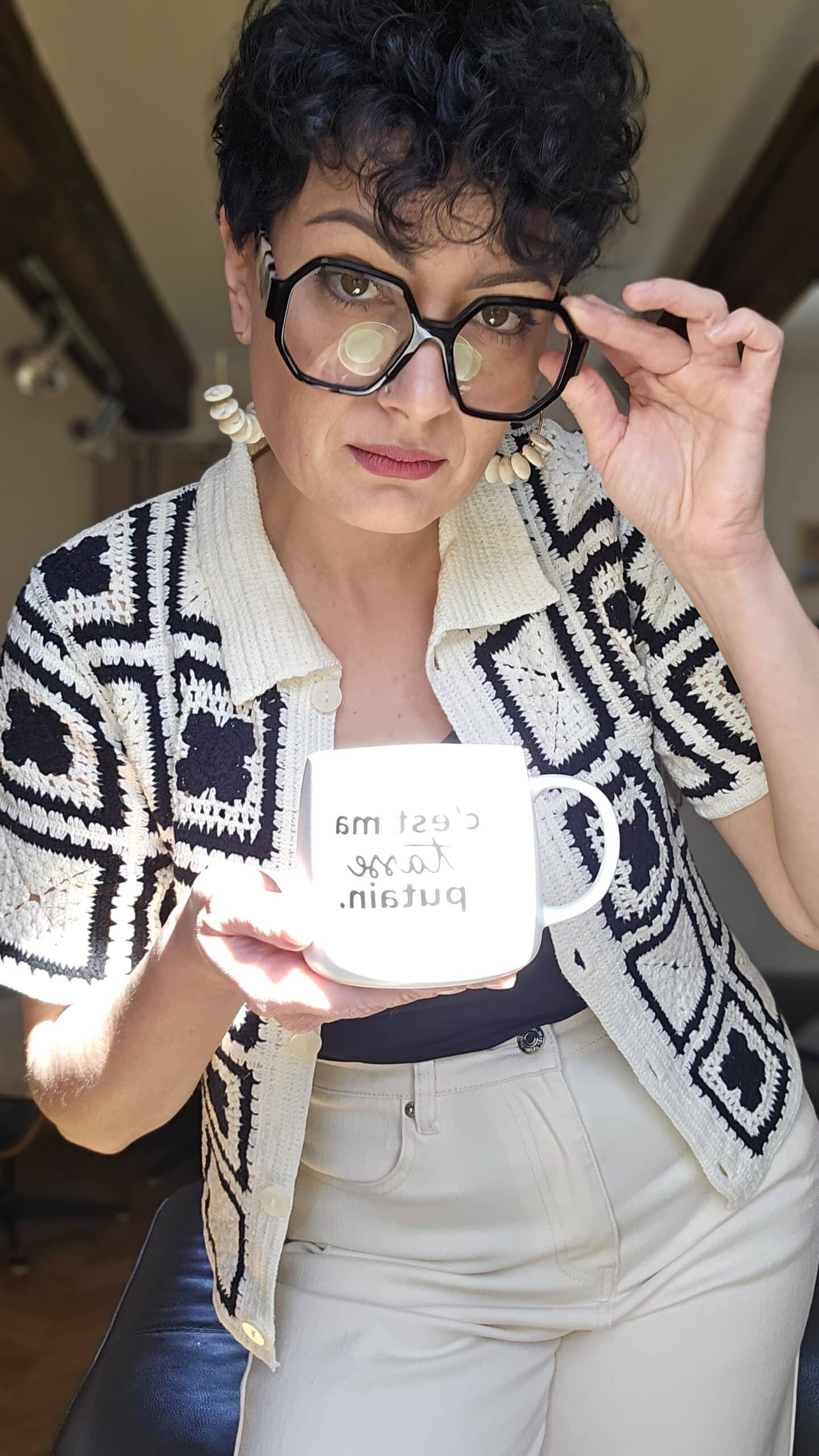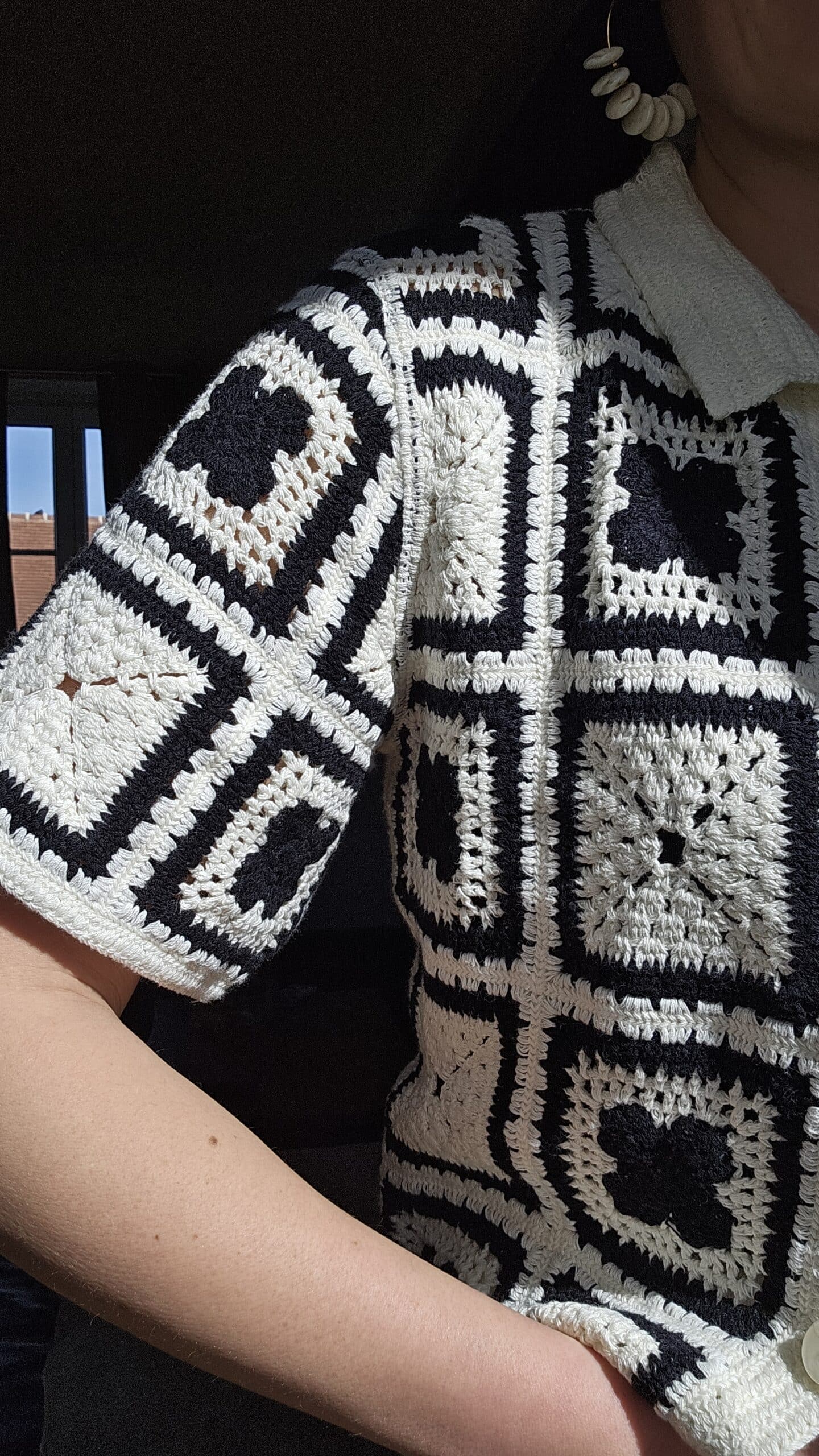 Ce gilet en crochet beige et noir sera parfait avec le jean beige broderie, un vent hippie soufflera sur ce look !