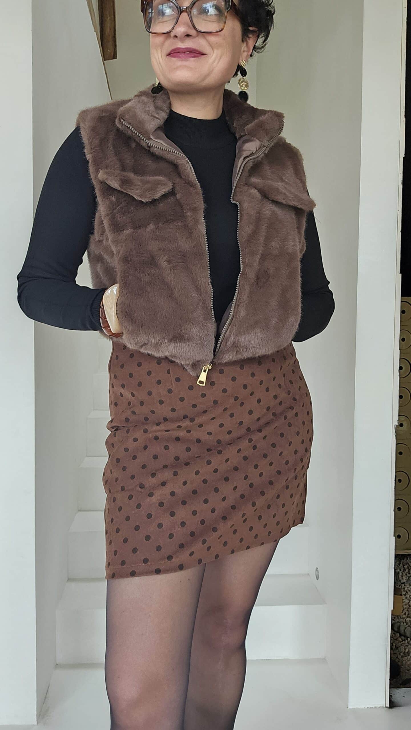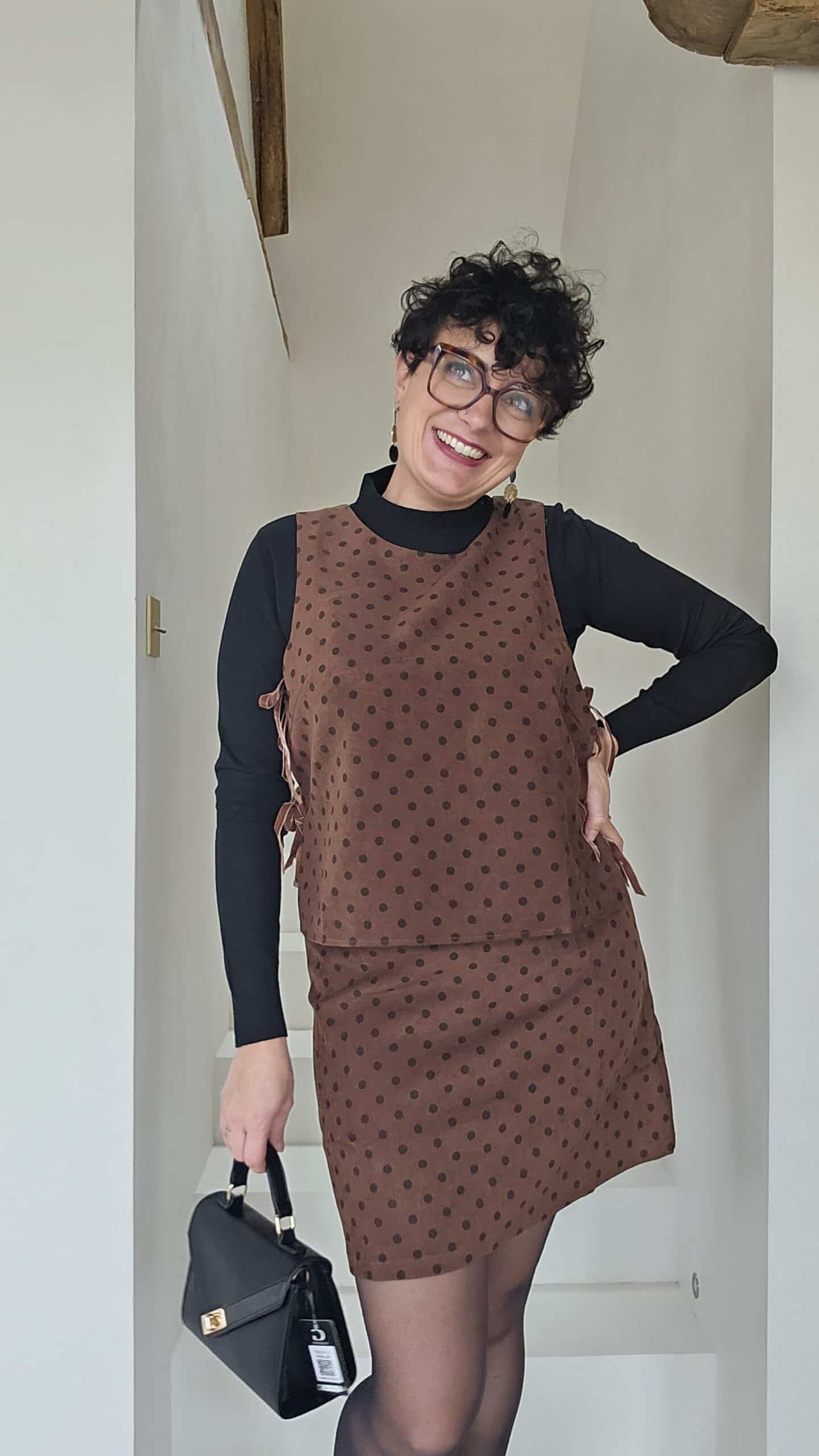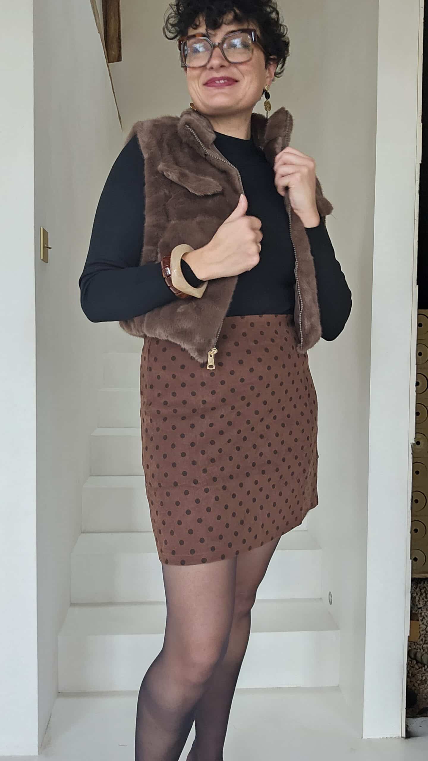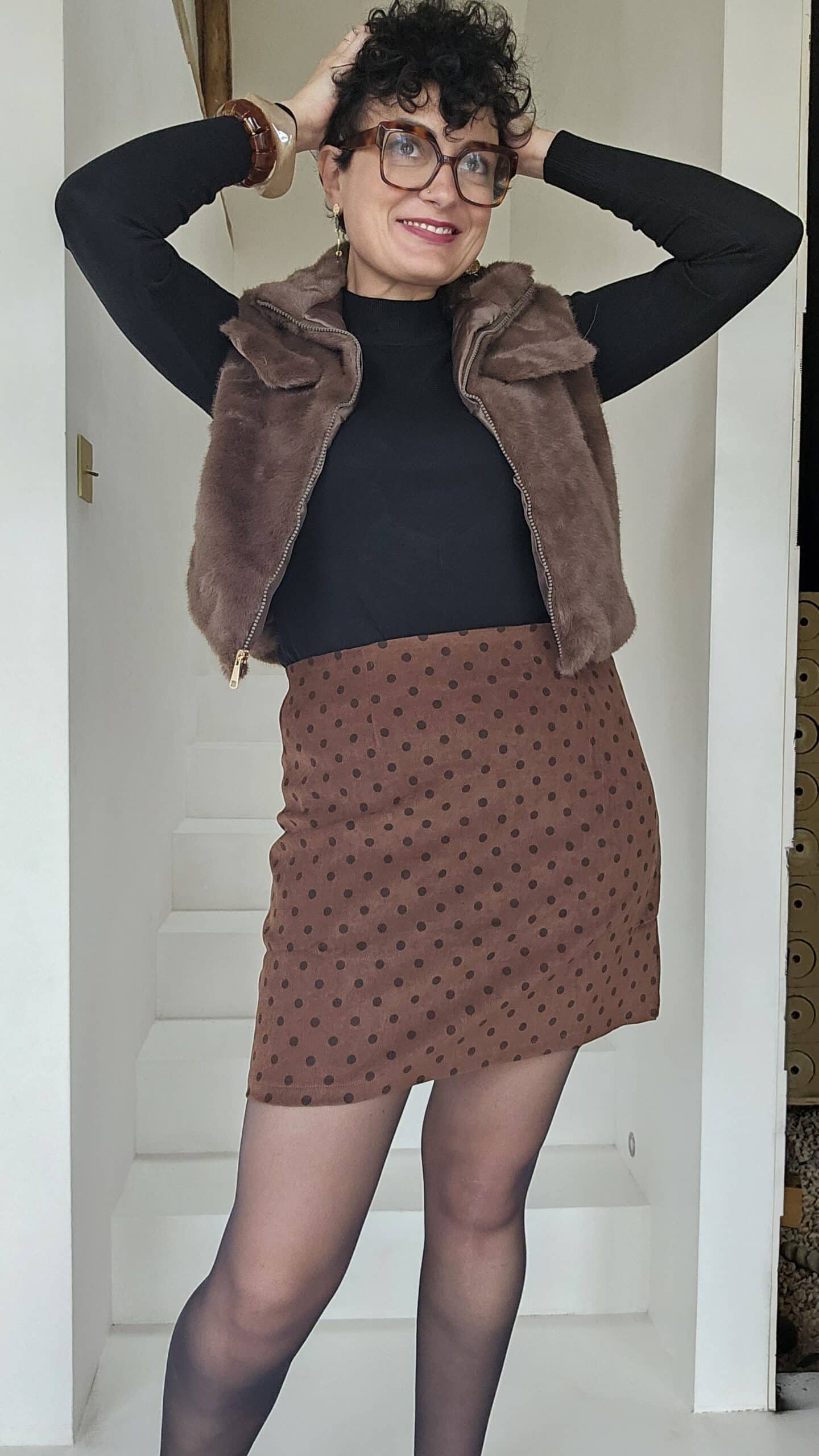 Jupe camel à pois noirs, effet velours ! Le total look avec le top Coline et sous pull Marc…aie aie aie !