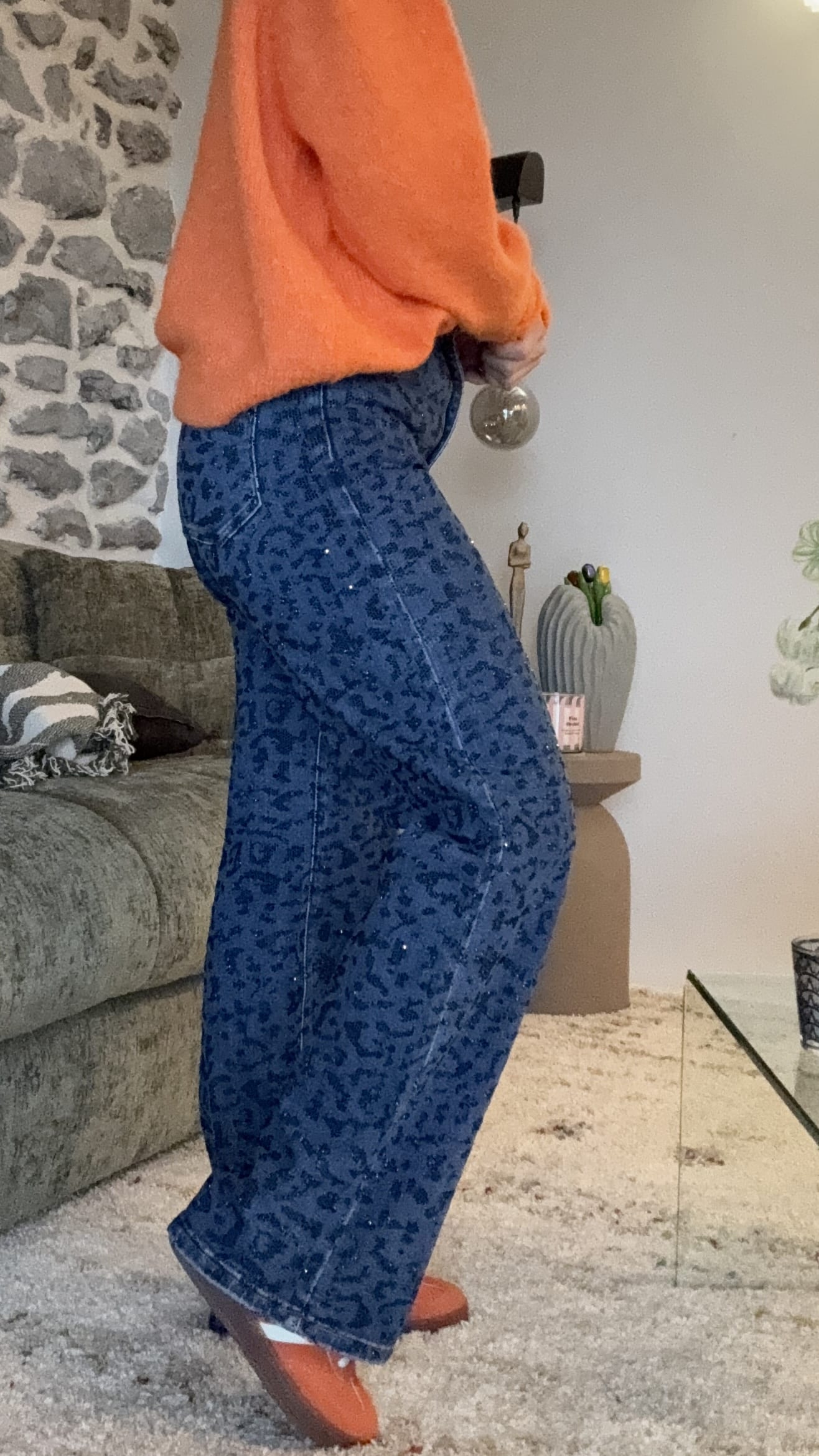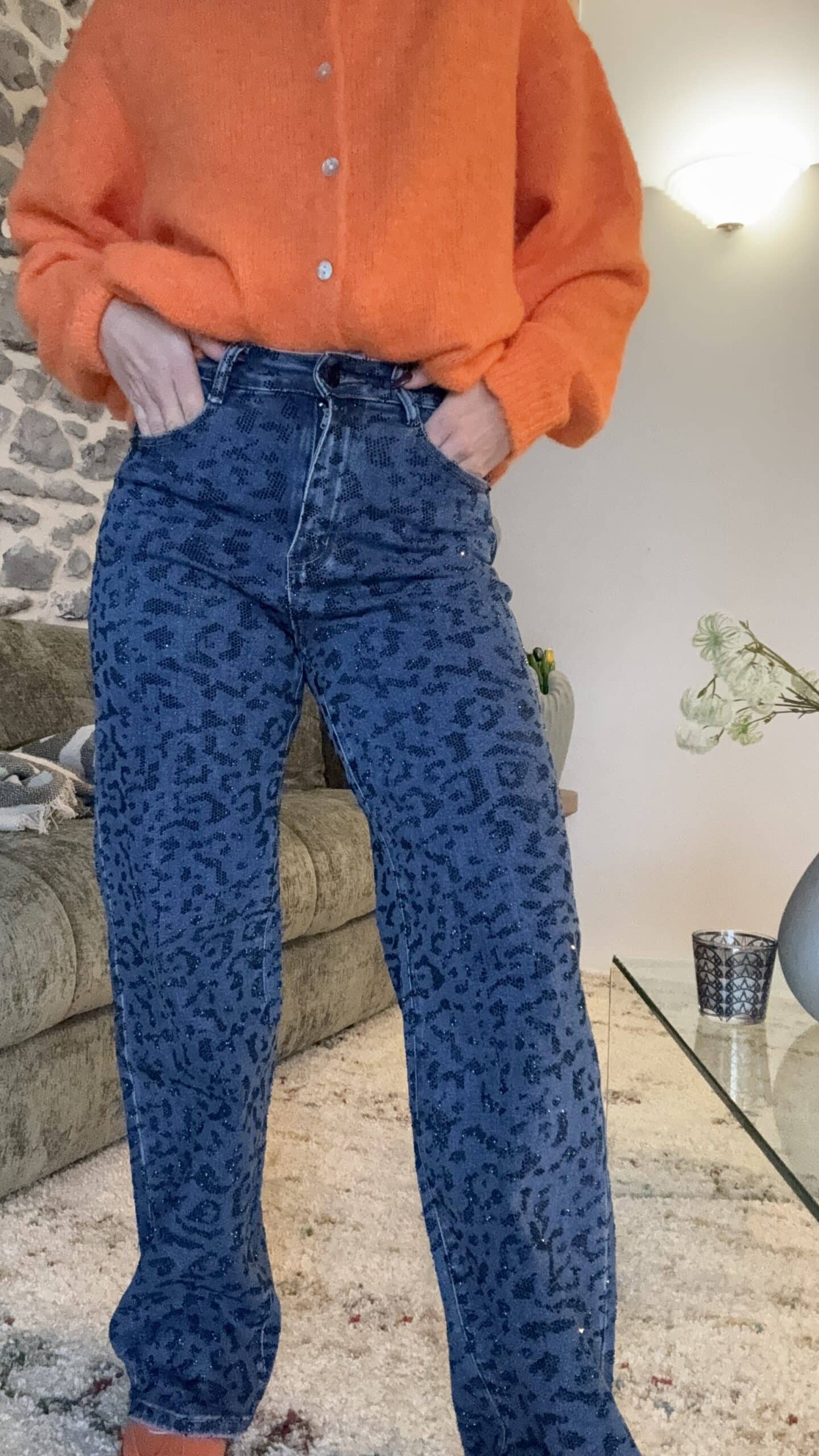 Pantalon bleu avec strass en motif panthère bleu foncé