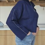 Pull bleu marine à zip avec bande fine blanche sur les manches