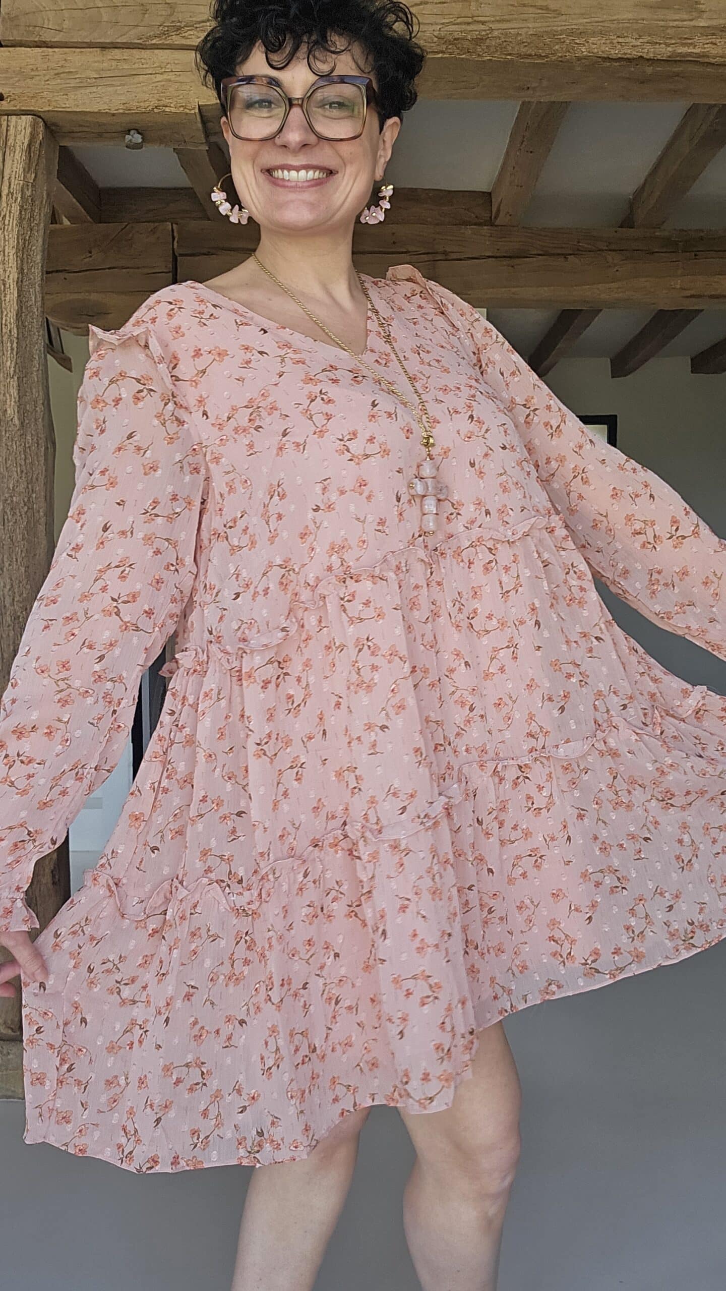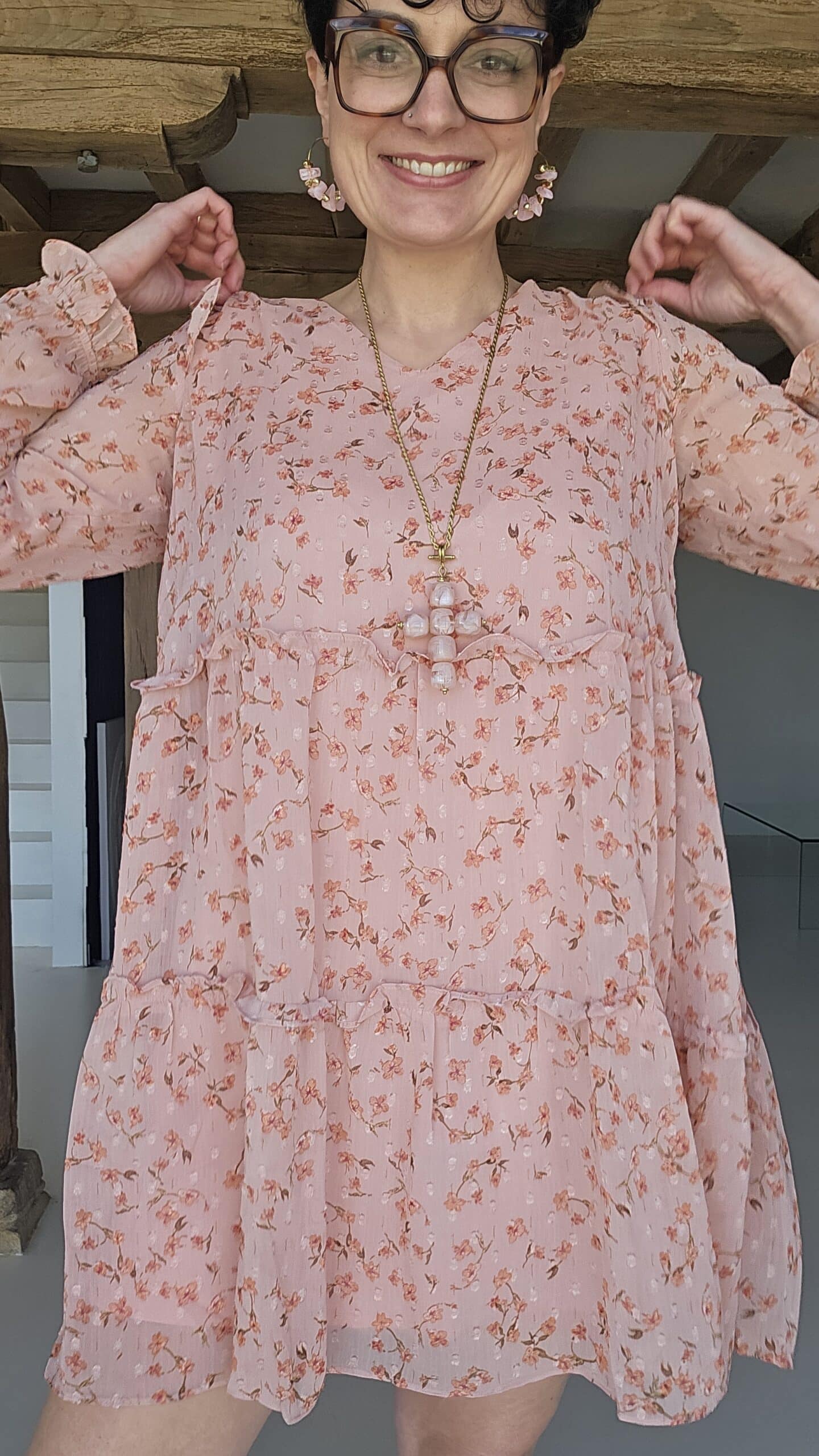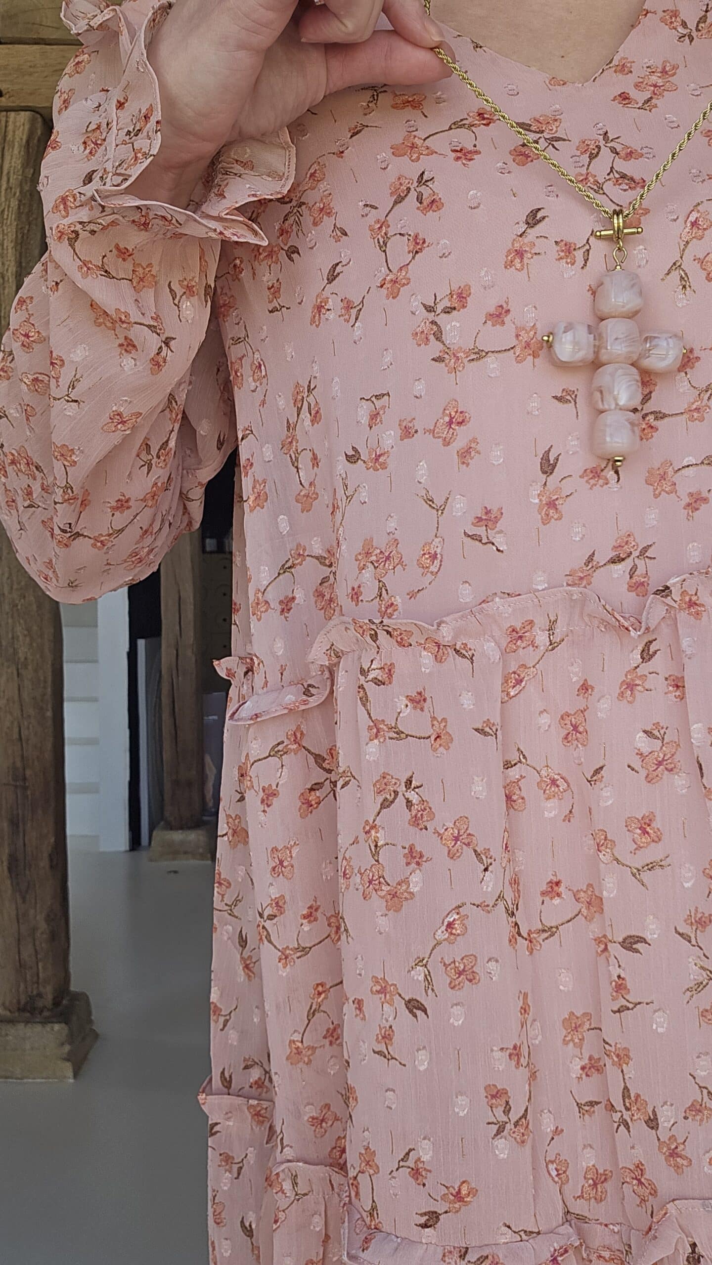 Robe romantique aux couleurs pastels, col V et manches longues.