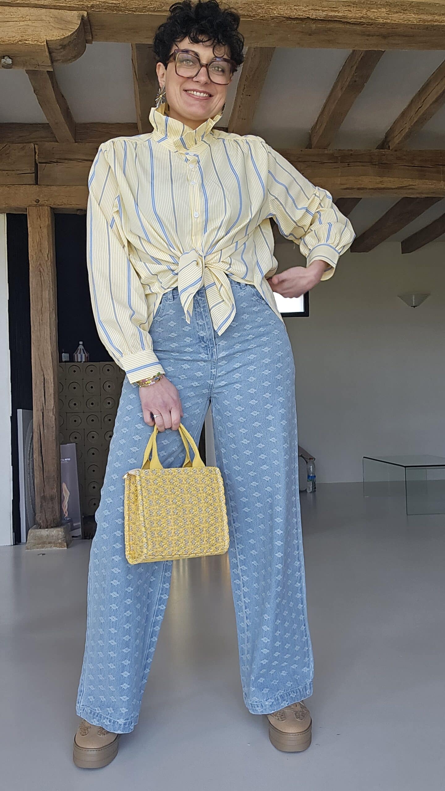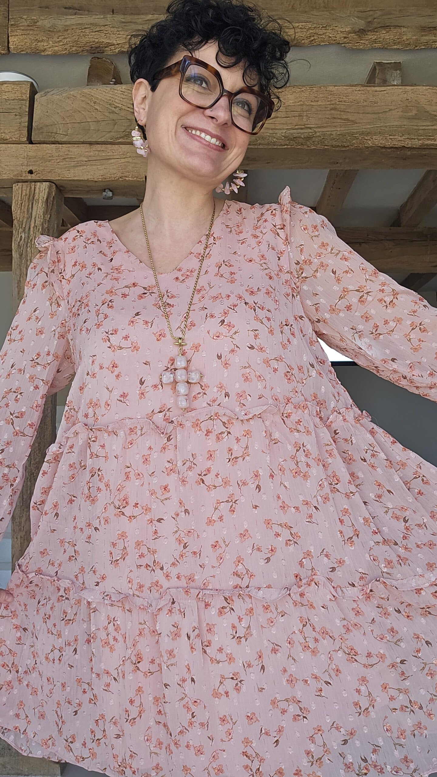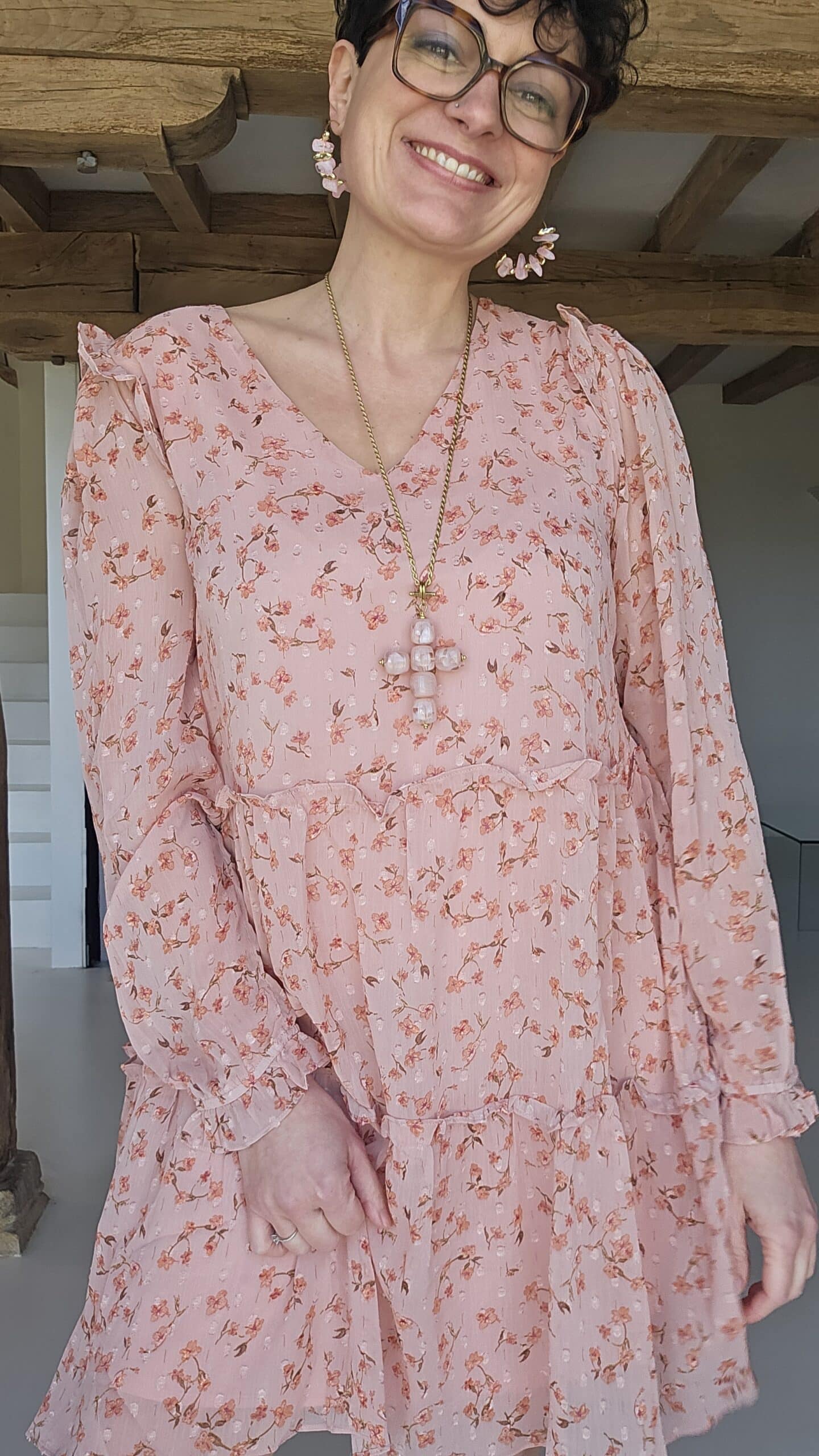 Robe romantique aux couleurs pastels, col V et manches longues.