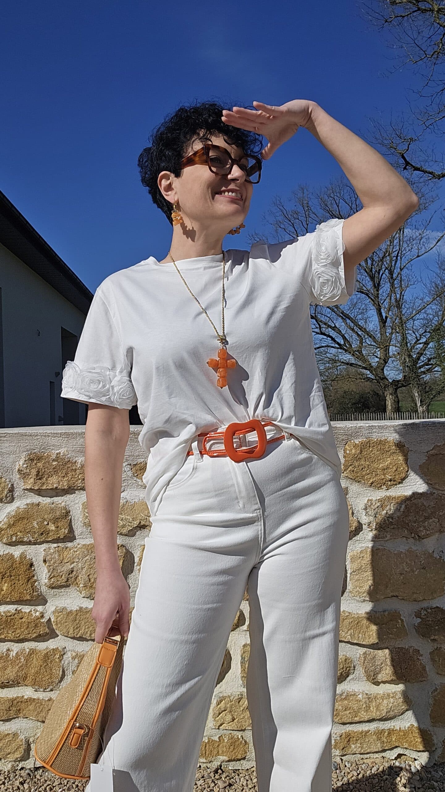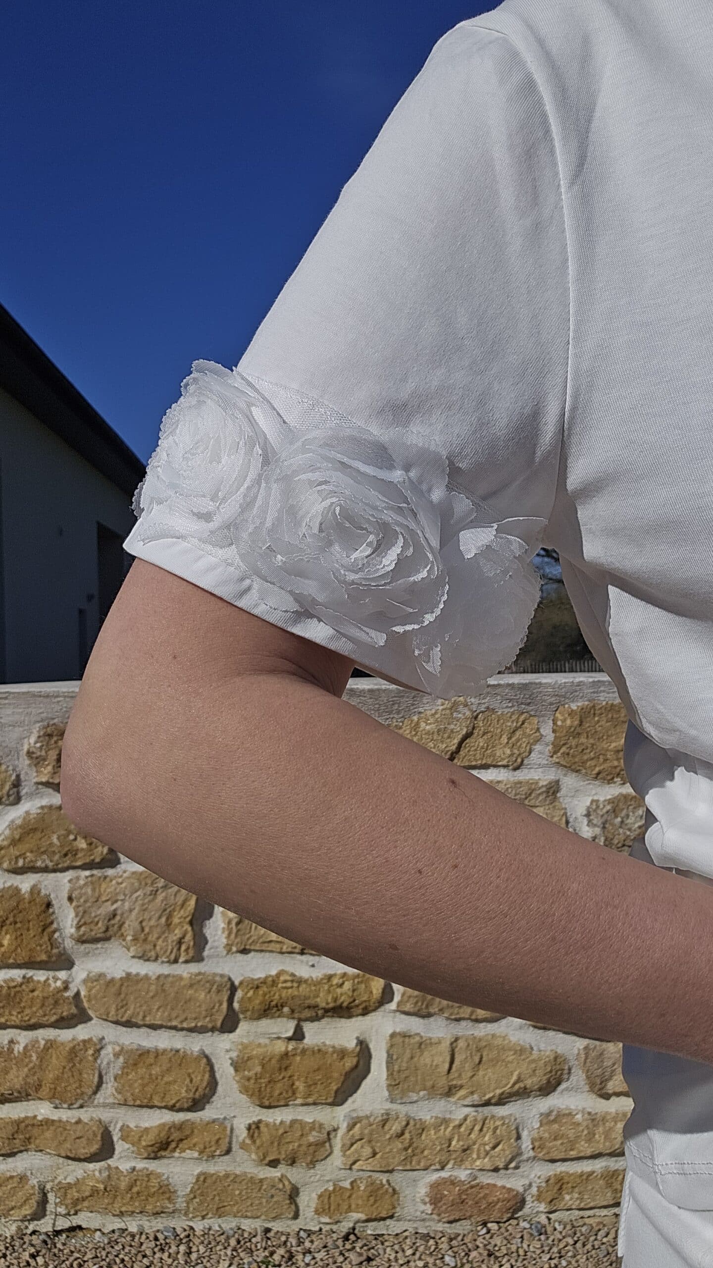Tee shirt blanc en coton avec les manches hyper travaillées grâce à ses fleurs !