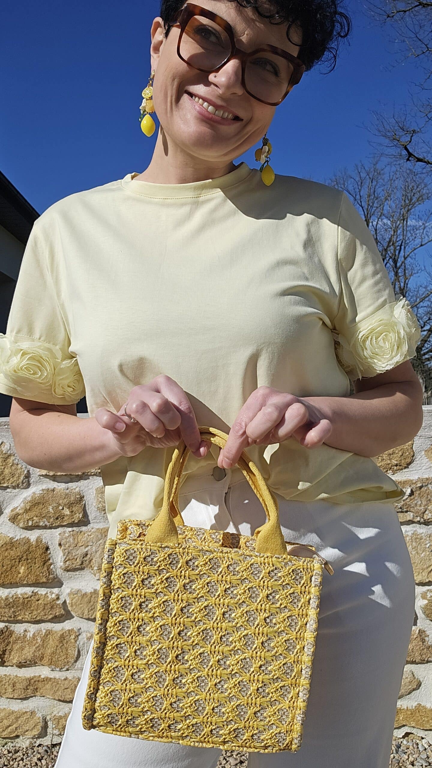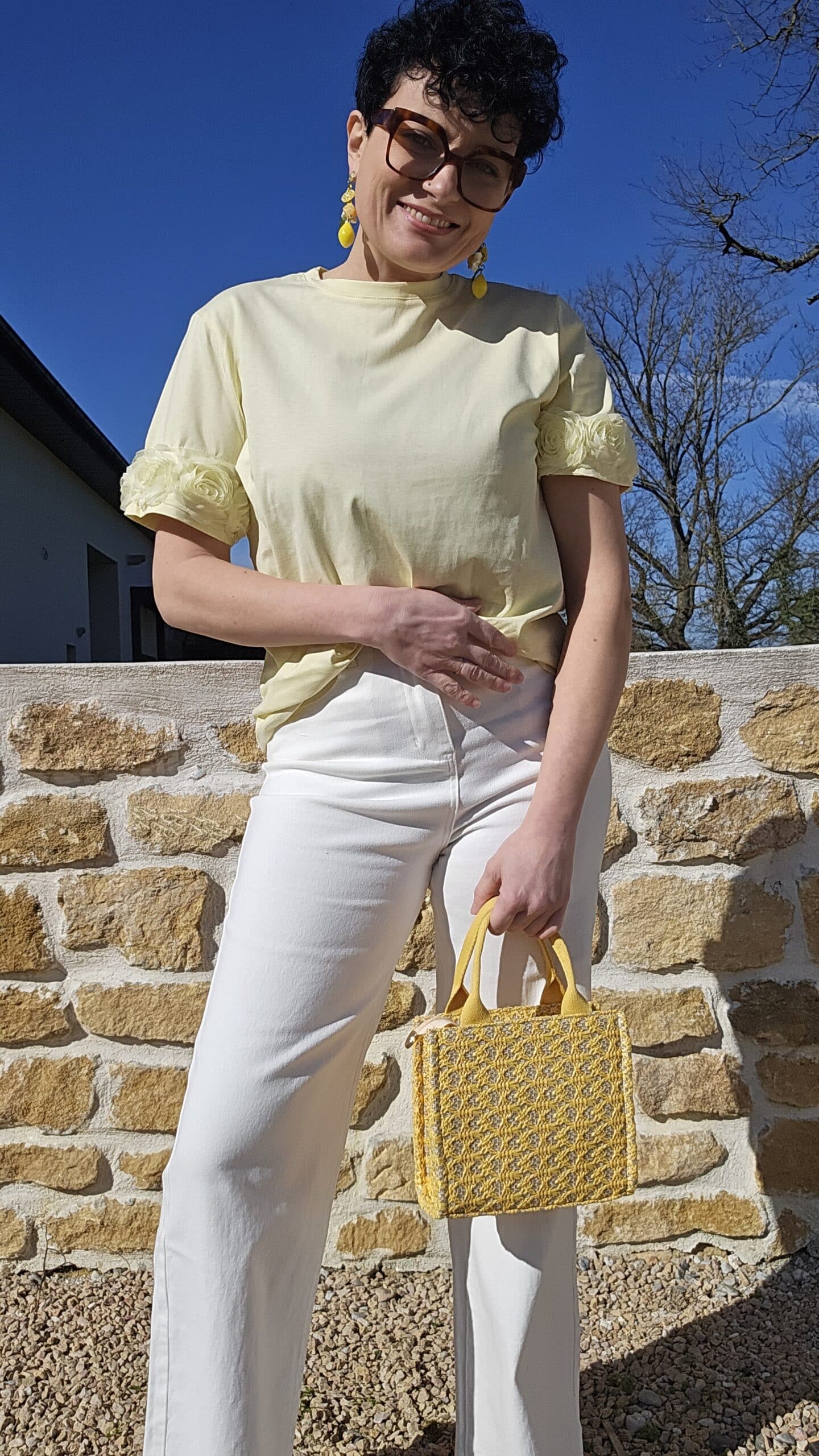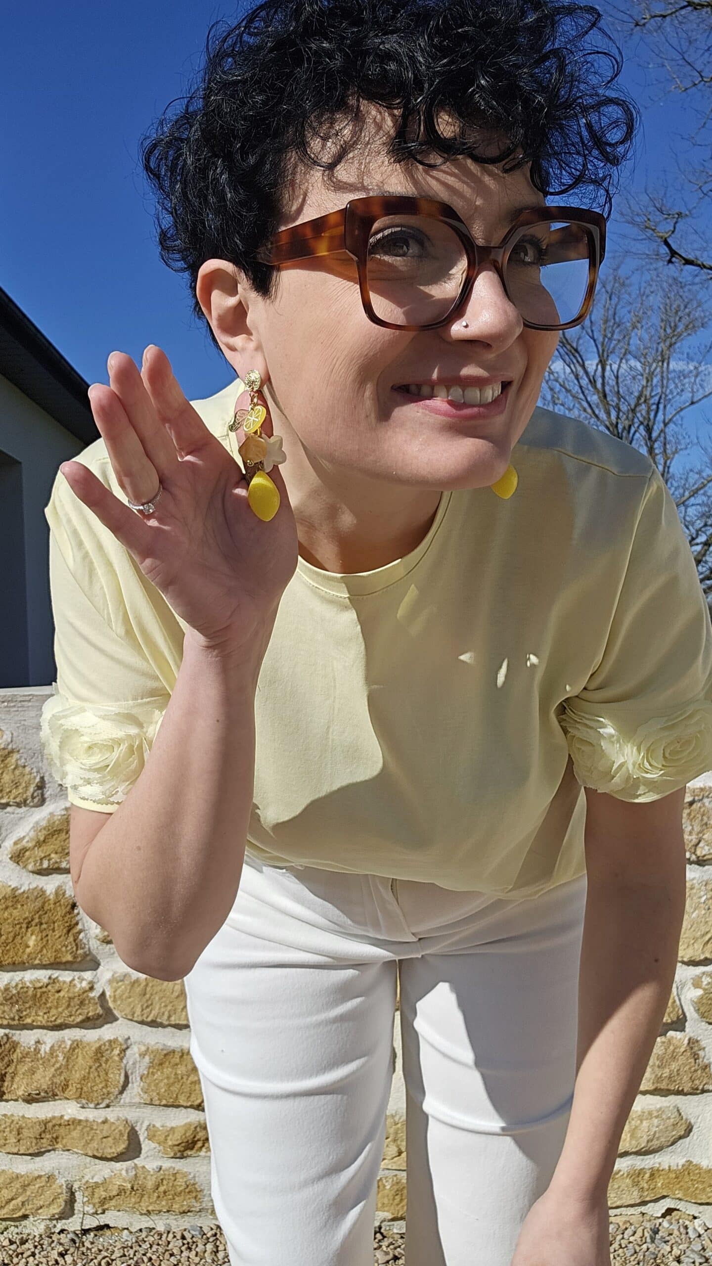 Tee shirt jaune beurre en coton avec les manches hyper travaillées grâce à ses fleurs !